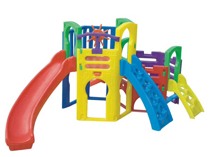 - Playground compacto com módulos em formato hexagonal com múltiplas atividades : escalada, escorregador curvo grande, escorregador reto pequeno, paredes para escalar, labirinto inferior