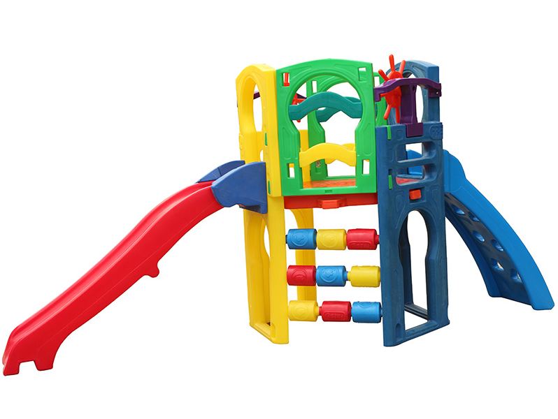 Possui 1 escorregador reto com corrimão em cor diferente no topo da rampa, 2 guarda-corpos com timão acoplado em cada um, 2 paredes com arco de proteção acoplado, 2 arcos com 2 peças de fechamento horizontais em cada arco.