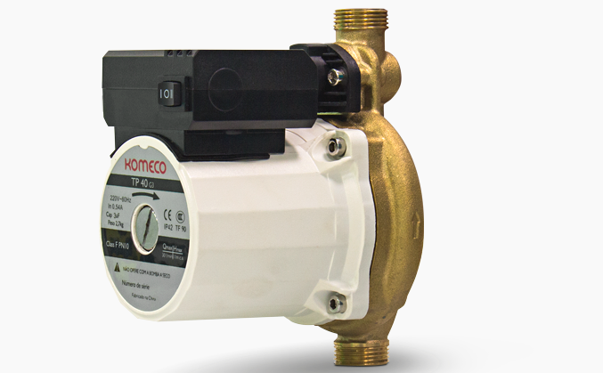 Motor de proteção térmica, acionamento automático por fluxostato e capacitador permanente ideal para uso direto em aquecedores de passagem, sistema solar e recirculação em sistemas fechados.